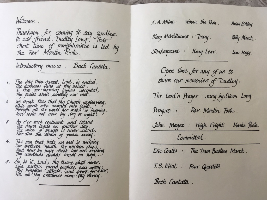 His funeral, in Crystal Palace, on 8th January 1996, was well attended, by friends, family & stars from the acting fraternity. Brian Murphy (Man about the house, George & Mildred) & his acting friend, Ian Hogg (Rockliffe’s Babies, Rockliffe’s Follies) were there. Ian Hogg read a passage from King Lear. Dudley’s friend, producer & actress, Polly March read an extract from Mary McWilliams diaries & Brian Sibley (Writer) read from AA Miles Winnie the Pooh. Dudley’s nephew Simon Long sang the Lords Prayer. Annette Andre (Randall & Hopkirk, deceased, The Saint) gave a lovely speech & shared her memories of the man she was fond of. She had been a big part of his life. His wake was held back at his flat in Crystal Palace. It was lovely to see everybody & marvel at Dudley’s memorabilia.