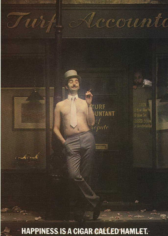 He appeared in many an Advert on TV, Including Club Biscuits, Lager ( as a Knight on Horseback) & most memorably, as a Turf Accountant, who lost his shirt, but hasn’t a care in the world & smoking….”A Hamlet Cigar” which apparently encompasses the epitome of happiness