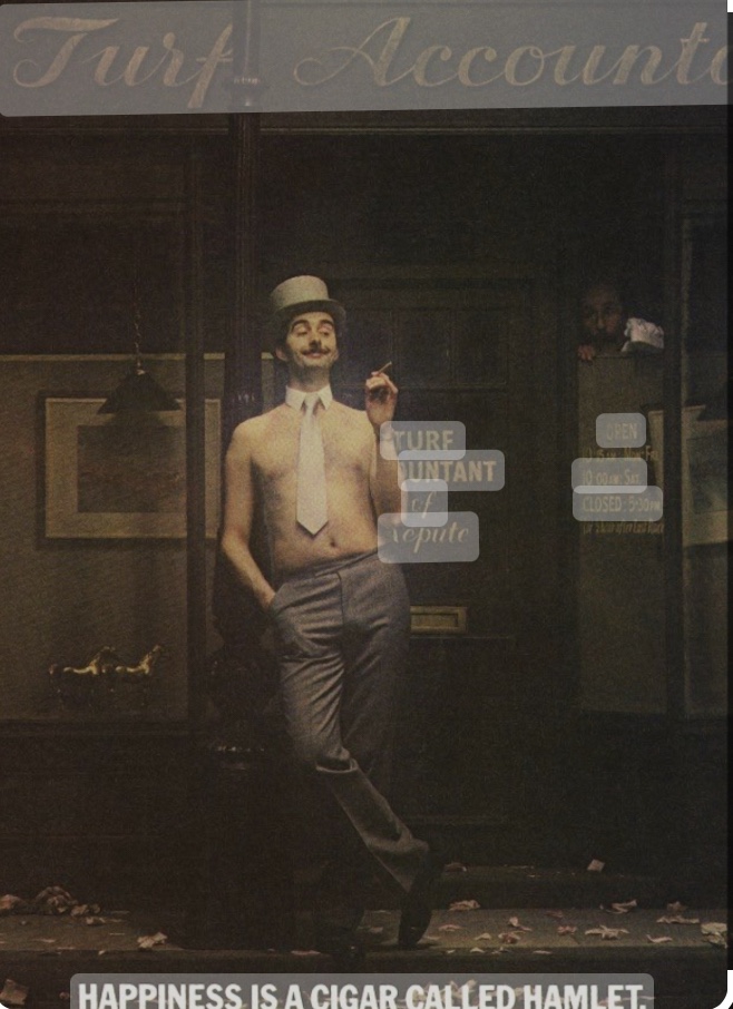 Dudley played the part of a man who even lost the shirt off his back, after a spell at his local turf accountants….but as the advert reminds us “Happiness is a cigar called Hamlet”. Dudley had a framed copy of the advert in his flat in Crystal Palace.