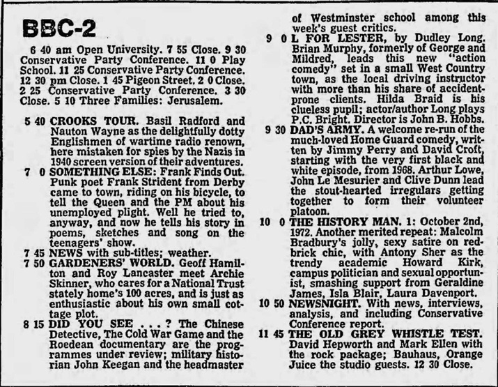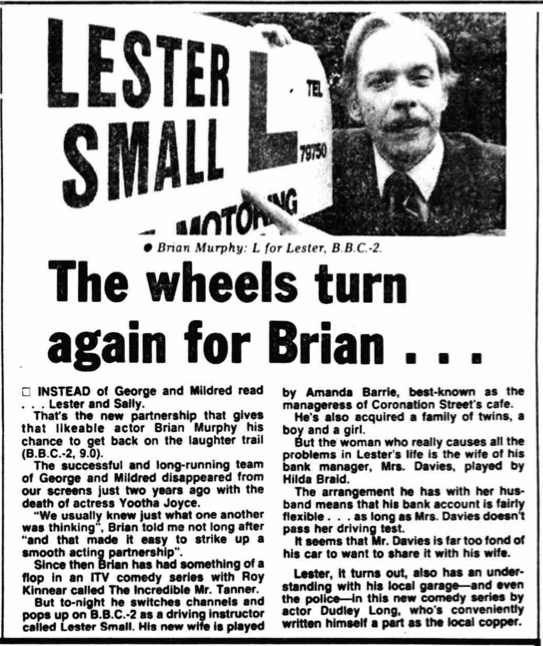 Dudley wrote a series of 6 episodes of “L for Lester” for the BBC. The programme followed the misfortunes of a small town driving instructor. It was intended as a new vehicle for Murphy after his previous hit show – George and Mildred – was retired following the sudden death of Yootha Joyce in 1980.. It also had actors Amanda Barrie, Richard Vernon, Hilda Braid, Colin Spaull, Linda Robson& James Cossins. Dudley also acted in the series, as Police Constable Bright