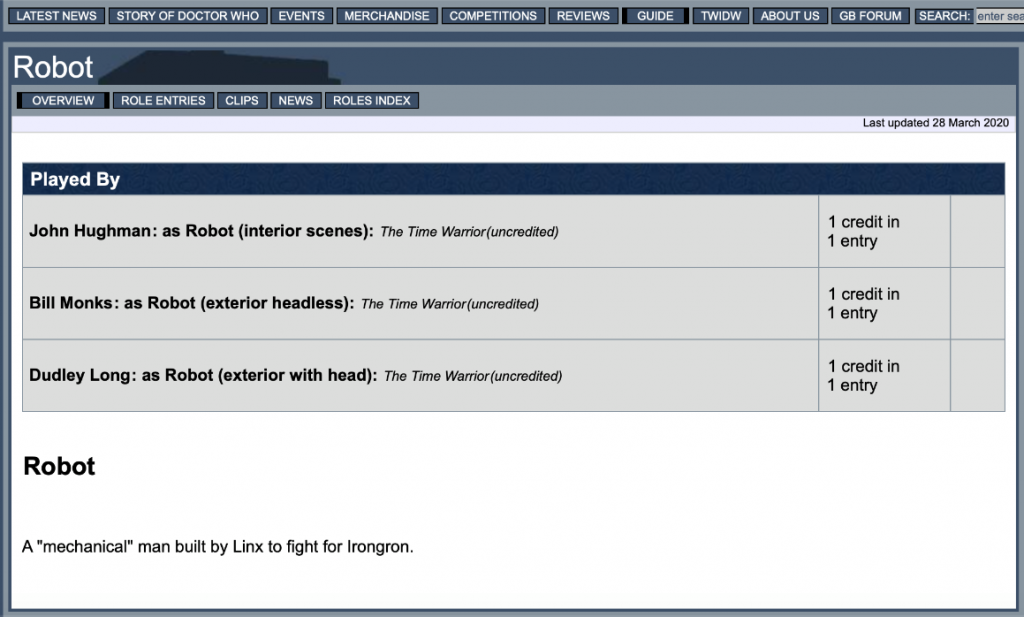 Dudley was cast as “The Robot” in 2 episodes of Dr Who according to Doctorwhonews.net